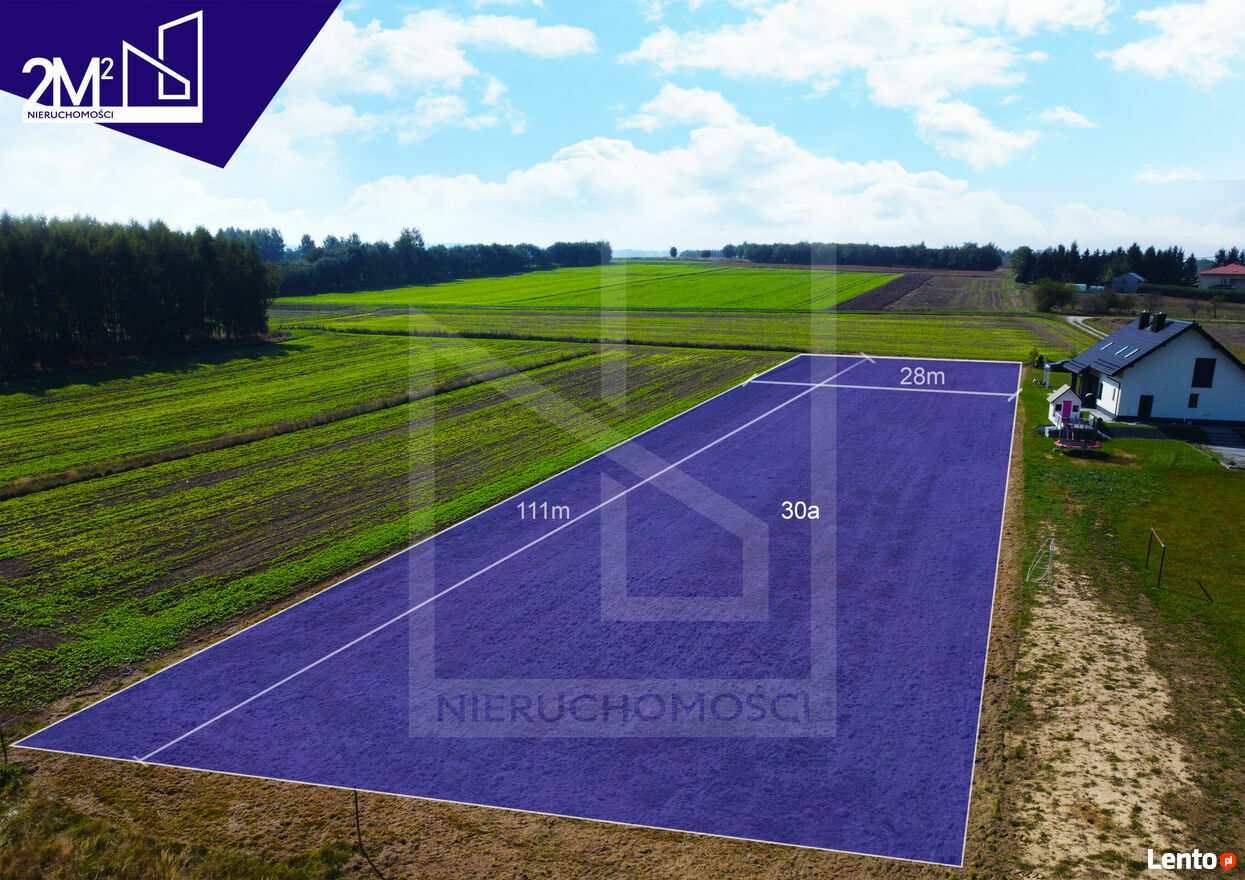 Teren do zabudowy posiada powierzchnię 30,00 arów oraz kształt prostokąta, co ułatwia znacznie zaprojektowanie, a także usytuowanie projektowanego budynku na działce. Nieruchomość posiada służebność przesyłu mediów dotyczącą energii elektrycznej oraz wody wpisaną w księgę wieczystą. Do działki prowadzi asfaltowa droga gminna, a ostatni odcinek to droga utwardzona. Bezpośredni wjazd na działkę możliwy jest dzięki ustanowionej służebności, uwzględnionej w księdze wieczystej (szerokości 5m).
